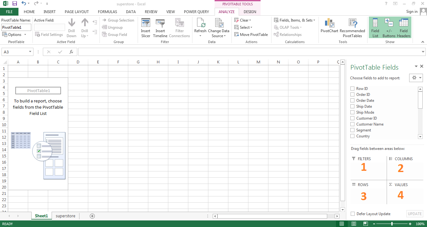 We are going to use Superstore Sales Dataset available in Kaggle. To get this dataset Click Here. If we use the pivot table in Excel, then It would look like below. It will have four fields to play with.