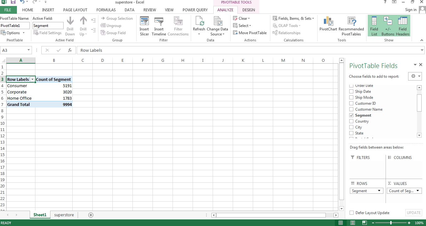 If we want to summarize Segments with its count, then we shall drag and drop the Segment field in Rows because we want to summarize the Segment field. We shall drag again Segment field to Values because we want counts in each segment. It is shown in the below image.